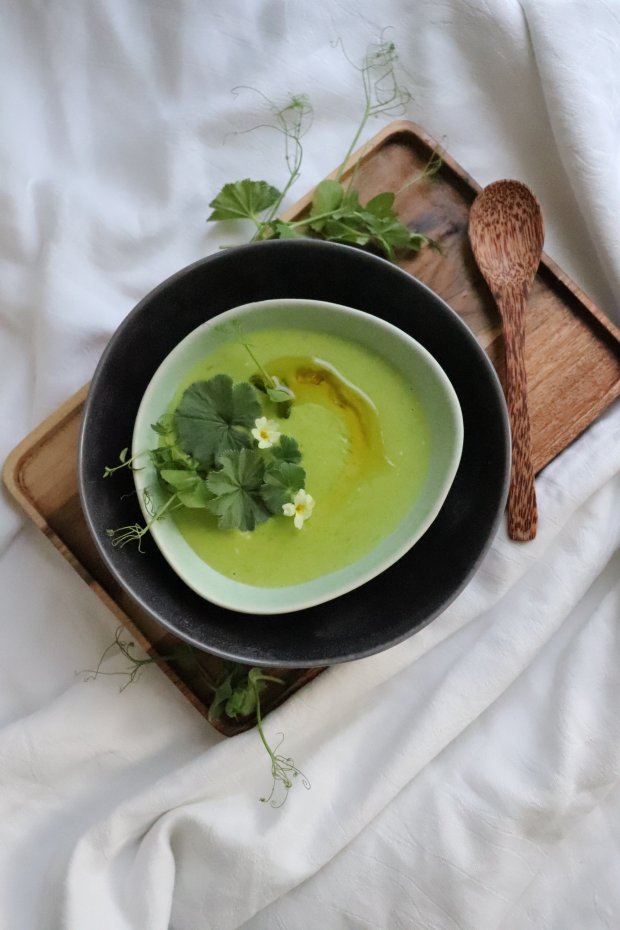 Hernekeitosta tulee mieleen laskiainen ja arkitorstai, mutta tämä kaunis pikkusisko Crème Ninon osaa pukeutua myös juhlaan. Aikainen kevät on suosinut pikku takatalvesta huolimatta kaltaistani hortoilijaa ja lautaselta on jo löytynyt tässä koristeena käytetyn poimulehden lisäksi mm. peltokanankaalta ja maitohorsmaa. Poimin pihaltani pari kukkaa kuvaan, mutta en suosittele kyseisen kukan (pihaesikon) syömistä, poistin ne keitosta heti kuvauksen jälkeen.