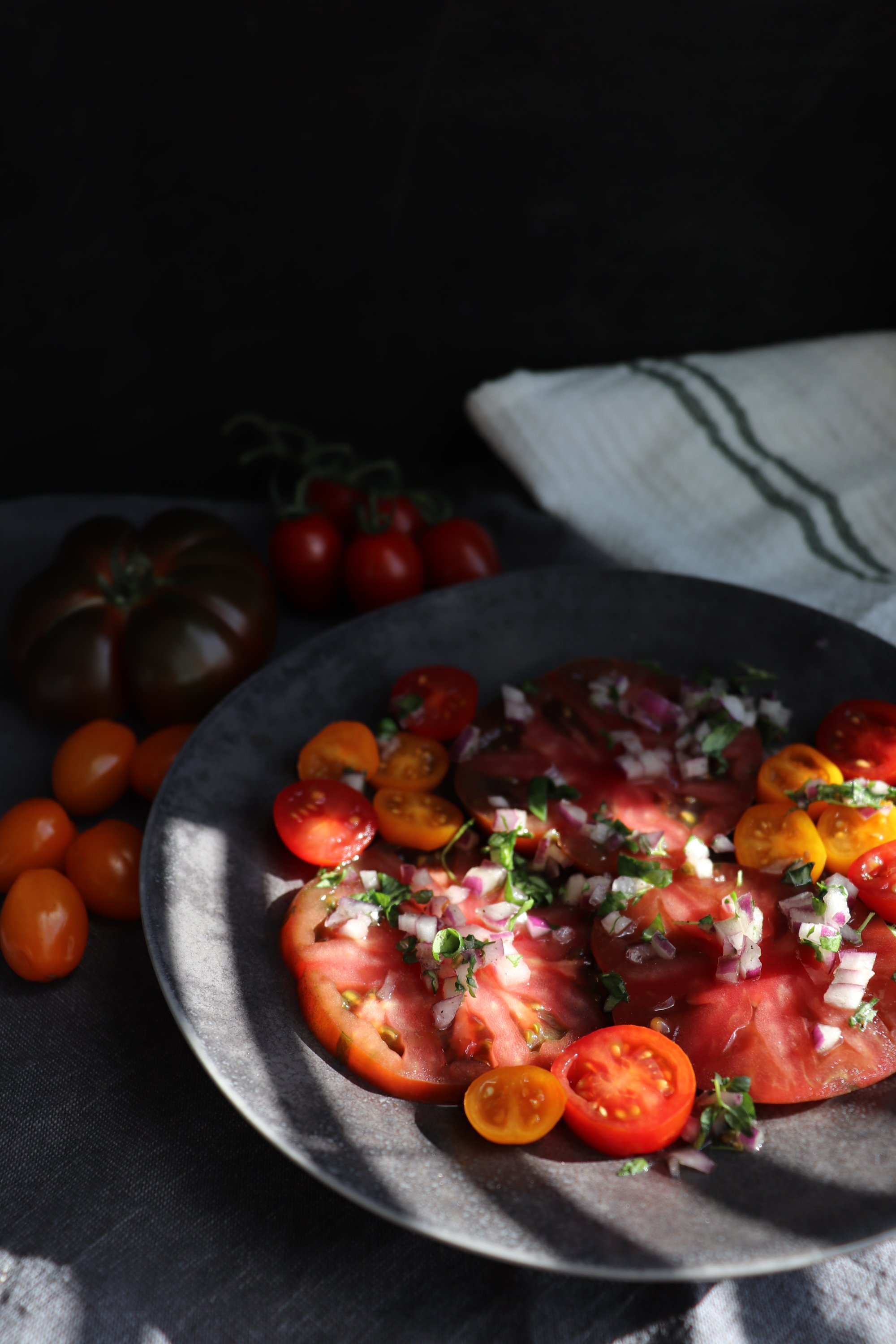Kesä tuo ihanat mehukkaat tomaatit kauppoihin ja toreille ja tomaateissakin näkyy oma lemppari ruokatrendini eli värit! Tähän salaattiin käytin kolmea eri tomaattia; punaisia ja keltaisia miniluumutomaatteja sekä vähän pelottavankin tummanpuhuvaa muistaakseni Black Krim -nimistä lajiketta. Taimikasvatus meni tänä vuonna tomaattien osalta vähän mönkään, mutta toivottavasti jostain löytyy erikoisempiakin taimia kasvihuoneeseen 😊. Niitä etsiessä turvaudun toistaiseksi kaupan hyllyihin. Jos kulhosi pullistelee perustomaatteja niin niistäkin tämän salaatin voi toki tehdä.