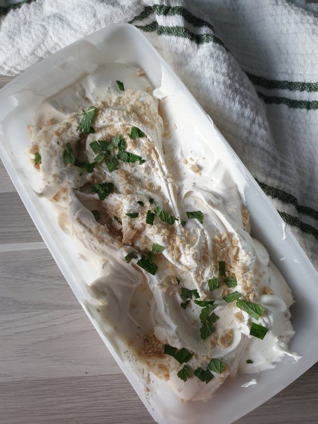 4) Sekoita joukkoon rouhittu vegaaninen valkosuklaa. Pakasta sopivassa muovirasiassa. Jos sinulla ei ole jäätelökonetta kannattaa jäätelöä pyöräyttää muutaman kerran pakastuksen alkuvaiheessa. Jos omistat jäätelökoneen, sekoita valkosuklaarouhe joukkoon vasta jäätelökoneen jälkeen ennen pakastusta.