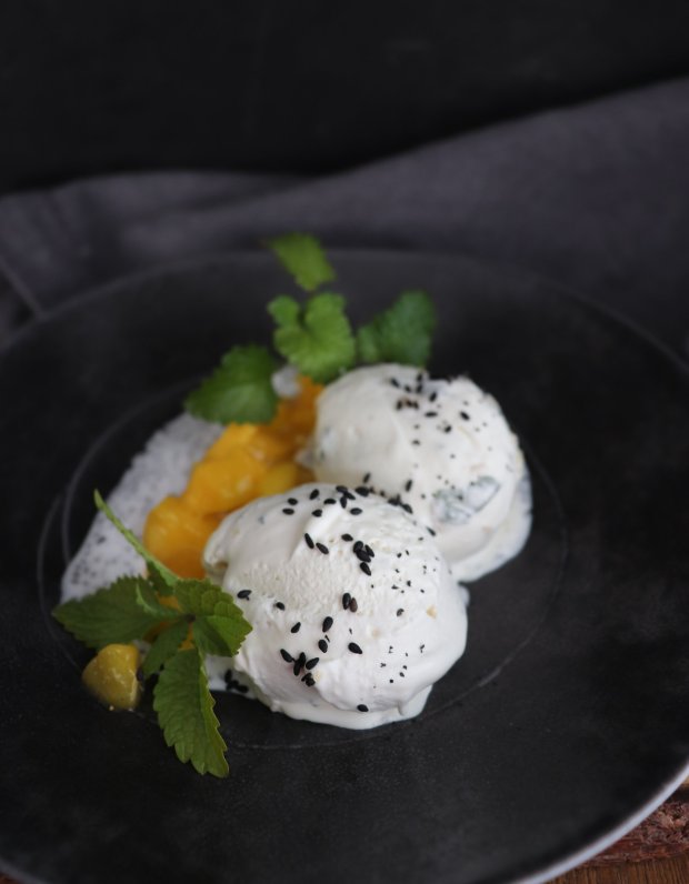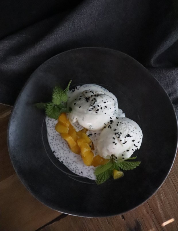 Aasialaistyylisen aterian loppuhuipennus: vegaanista limejäätelöä, chia-kookoskastiketta, mangoa, sitruunamelissaa ja mustia seesaminsiemeniä.