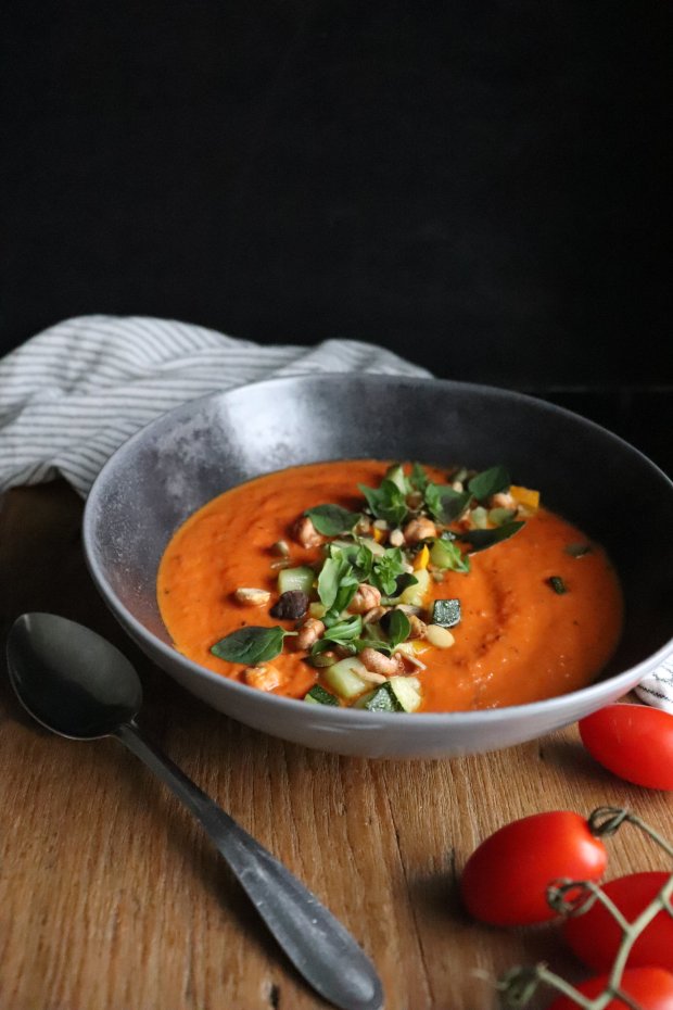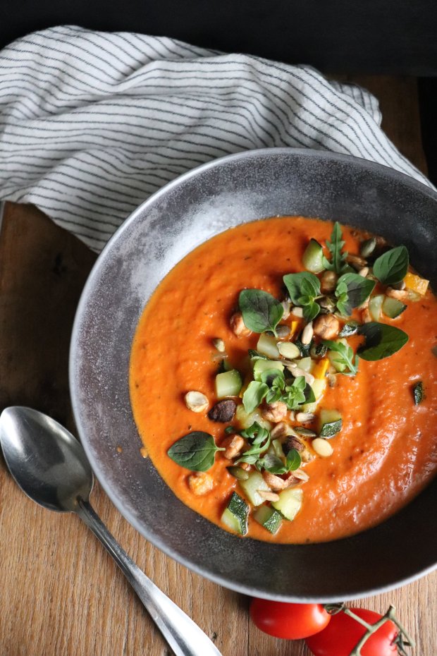 Tomaattikeitto paistetulla kesäkurpitsalla