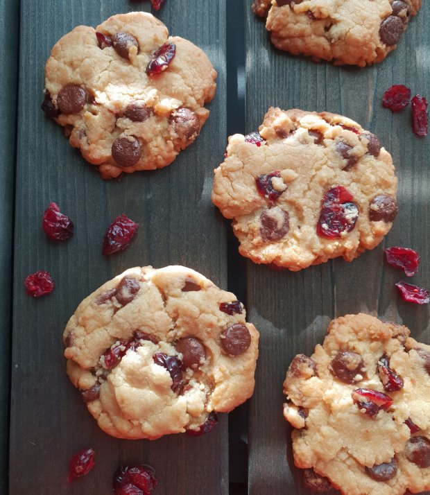 4) Ota taikinaa hieman golfpalloa pienempi pala, pyöritä se tasaiseksi ja painele leivinpaperoidulle uunipellille pyöreäksi keksiksi. Toista kunnes taikina loppuu. Halutessasi voit painella suklaahippuja vielä keksien pintaan.