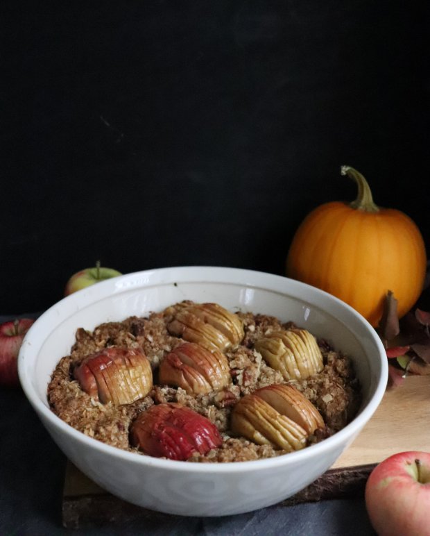 4) Kaada muruseos vuokaan. Tee omenille pienet kolot ja asettele ne muruseokseen. Voit halutessasi valuttaa hitusen vaahterasiirappia ompuille. Paista n.30min.