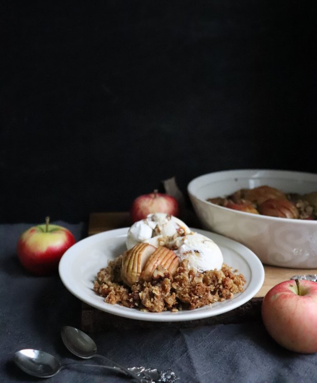 Joskus elämä yllättää. Parhaimmillaan positiivisesti eli vaikkapa tuomalla yllätysvieraita ovelle. Silloin on a) kiva löytää pakastimesta sulatettavaa kahvipöytään, b) leipoa jotain pikaista tai c) ihan höpötellä sen kahvi/teekupposen äärellä. Jos päätyy vaihtoehtoon b), ehdotan kuvan herkkua näin syksytunnelmaan sopien. Makujen tasapaino on aina oma juttunsa, mutta lämpimän ja kylmän tasapaino on ruuassa myös mahtavaa! Siksipä kehotan pitämään siellä pakastimessa jäätelöä, jolloin voit yhdistää yllätysvierasreagoinnissa vaihtoehdot a) ja b).