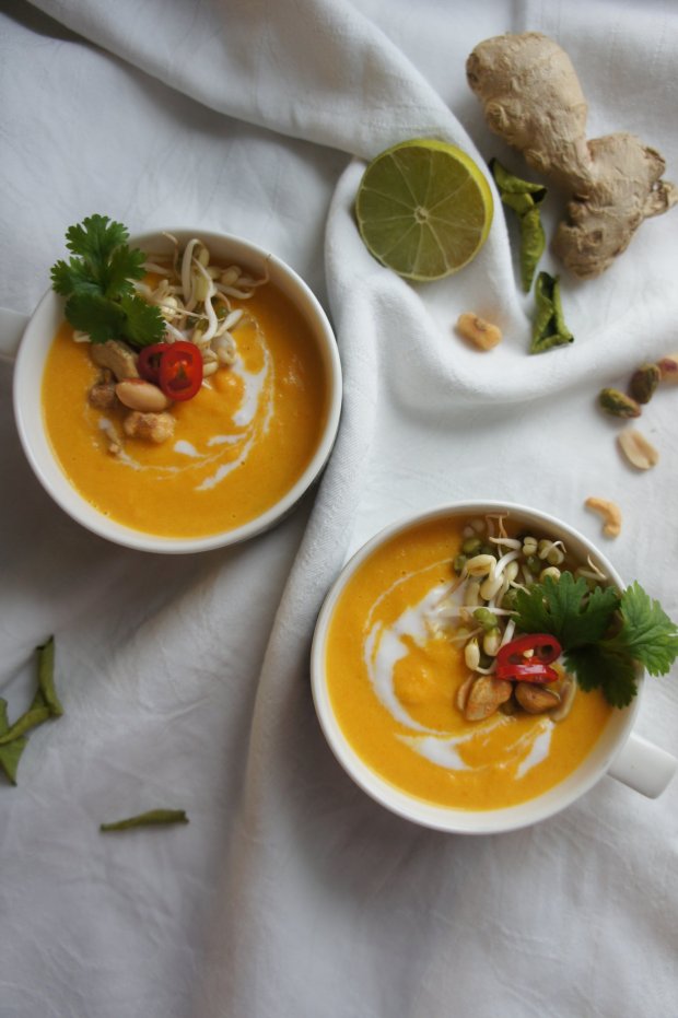4) Lisää limemehu ja soseuta keitto. Mikäli keitto on liian paksua notkista sitä vedellä. Maista suolaisuus, lisää sitä tarvittaessa.