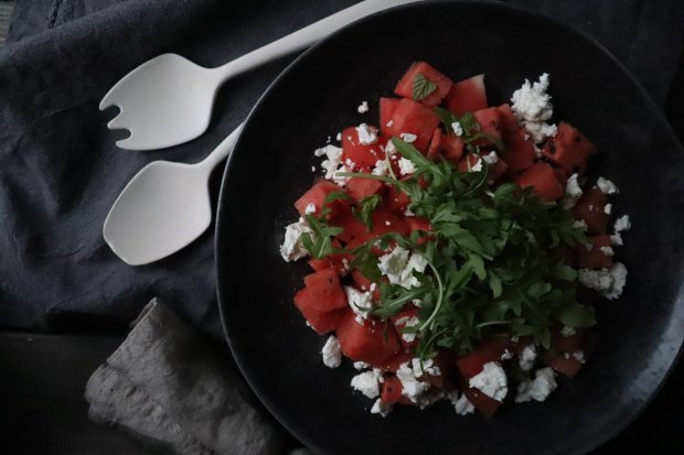 Vesimeloni on hellekesän merkki, ainakin löytyessään meidän keittiöstä. Esikoiseni ei hellepäivinä pienenä oikeastaan muuta syönytkään – ehkä kurkkua lisäksi. Kuvasin salaatin aiheeseen vähän epäsopivasti harmaana sadepäivänä, sen vuoksi kuvat eivät nyt luo välttämättä hellepäivän tunnelmaa 😅. Palkkatöiden ja perheenäidin töiden vuoksi en aina pysty ajoittamaan tätä ruokakuvausharrastusta parhaisiin mahdollisiin hetkiin. Mutta onneksi kuvista nyt silti selvää saa 😉.