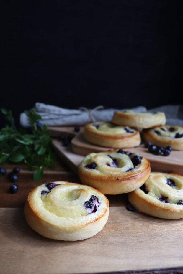 4) Valmista täyte: Sekoita kermaviili ja kananmuna sekä sokerit kulhossa. Lisää 3dl mustikoita, sekoita. Kaada taikinapohjan päälle ja ripottele vielä loput 0,5dl mustikoita pinnalle. Huom! Jos käytät pakastemustikoita, sekoita niihin 1rkl perunajauhoja ja pidennä paistoaikaa pari minuuttia.