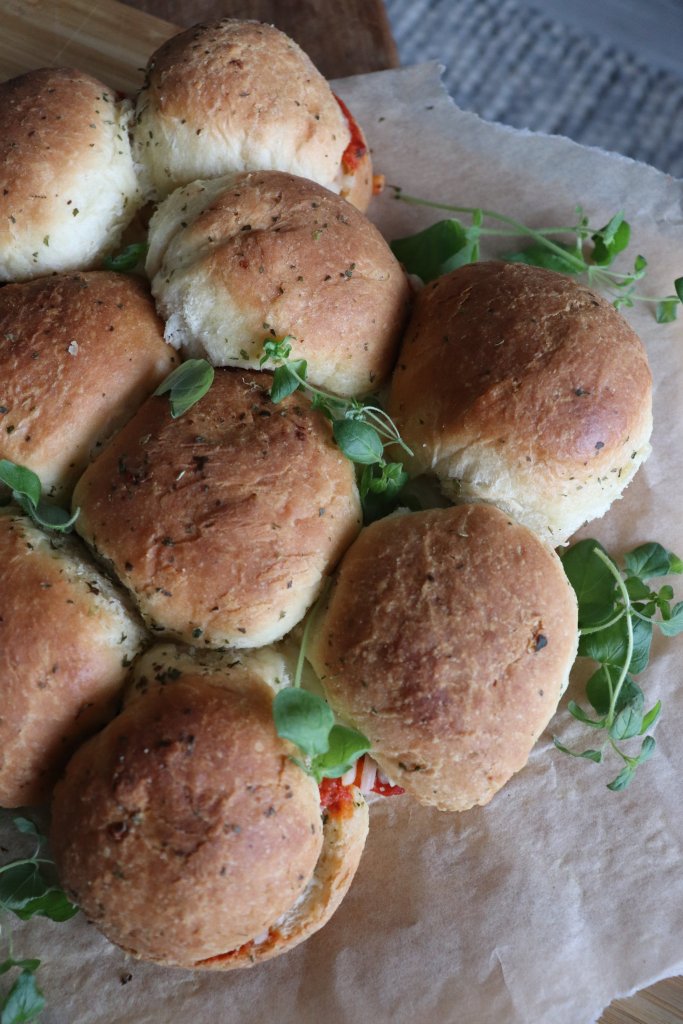 Tämä herkku on tehty jaettavaksi! Pizzan makumaailman omaavat sämpylät sopivat brunssille, iltapalaksi tai vaikka keiton oheen aterialle. Täytteeksi voi tämän ohjeen helpon ’pizza margarita’ idean lisäksi laittaa, mitä nyt pizzaan muutenkin 😊. Sämpylät ovat mahtavia myös sellaisenaan ja säilyvät kotileivonnaiseksi erittäin hyvinä ja mehevinä seuraavaankin päivään.