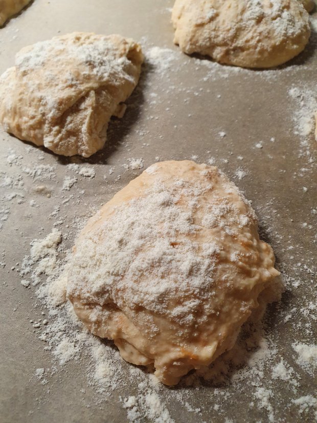 6) Nostele taikinasta jauhotetuin käsin tai kahdella lusikalla sämpylät paperoidulle uunipellille. Jauhota sämpylöiden pinnat. Anna kohota uunin lämmetessä.