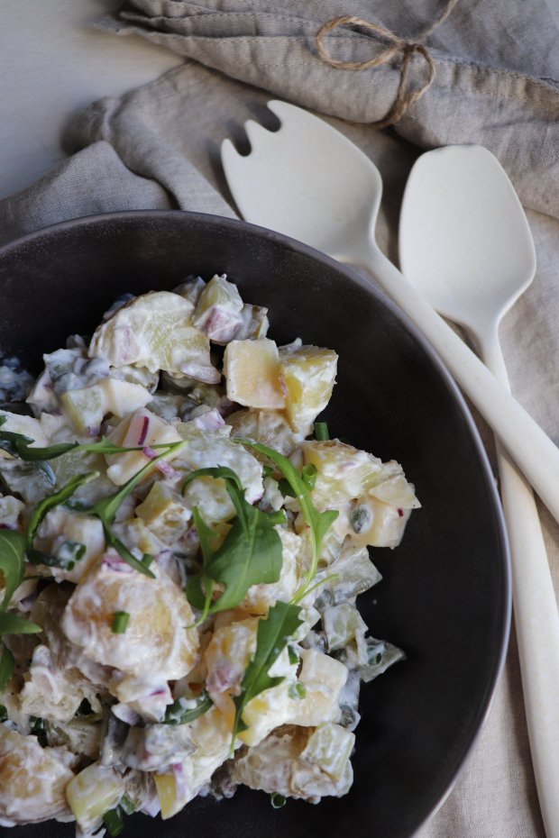 Kuvan salaatissa on sipulina punasipuli, mutta sen tilalle sopii oikein hyvin vihreävartinen uuden sadon sipuli tai vaikka ruohosipuli yrttimaalta, jos sellainen sattuu pihasta löytymään. Salaatin juju on majoneesittomuus, sen ansiosta tämä perunasalaatti on kevyt ja raikas.