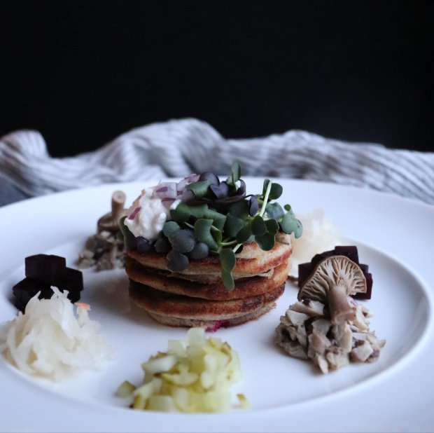 5) Kun perunat ovat lähes valmiita, valuta kikherneistä liemi. Raasta / purista valkosipulinkynsi. Kuumenna paistinpannulla tilkka oliiviöljyä ja paista kikherneitä ja valkosipulia hetki. Mausta suolalla ja pippurilla.